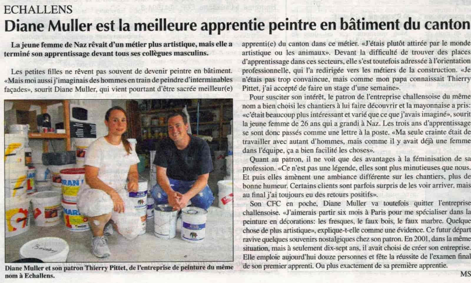 Son CFC en poche, Diane Muller va toutefois quitter l’entreprise challensoise. « J’aimerais partir six mois à Paris pour me spécialiser dans la peinture en décorations : les fresques, le faux bois, le faux marbre. Quelque chose de plus artistique », explique-t-elle comme une évidence. Ce futur départ ravive quelques souvenirs nostalgiques cher son patron. En 2001, dans la même situation, mais à seulement dix-neuf ans, il avait choisi de créer son entreprise. Elle emploie aujourd’hui douze personnes et fête la réussite de l’examen final de son premier apprenti. Ou plus exactement de sa première apprentie.